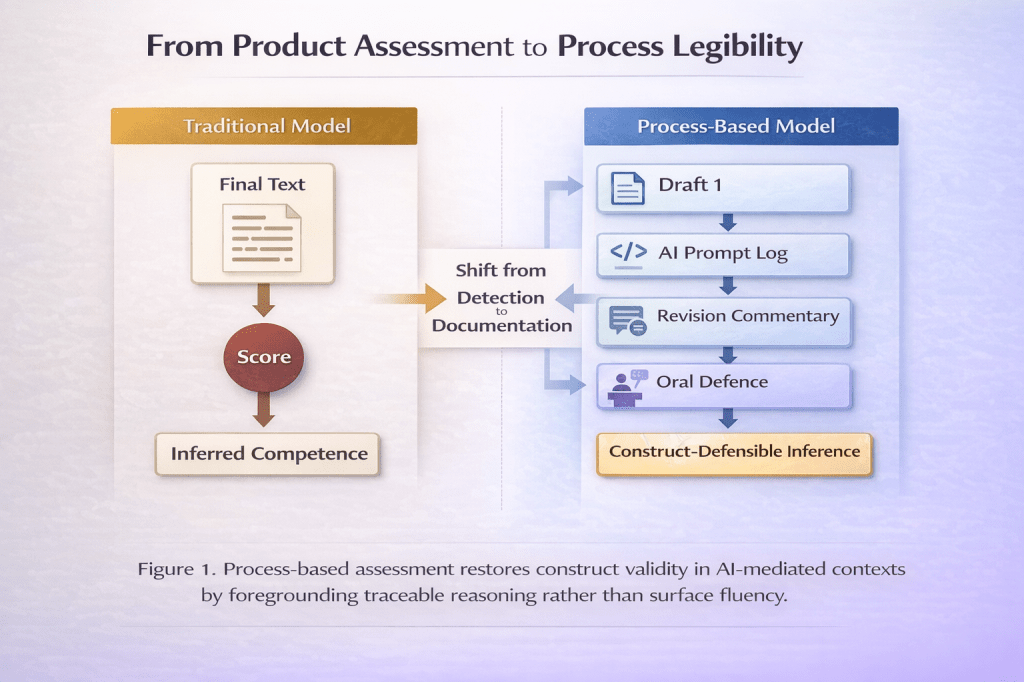 The proliferation of generative AI in writing contexts has rendered traditional product-based assessment epistemically unstable. When fluent texts can be algorithmically generated, the central concern shifts from authorship detection to construct defensibility. Attempts to police AI use through detection technologies have proven both unreliable and ethically problematic (Perkins et al., 2023). The more urgent question is not how to identify AI-generated text, but how to redesign assessment so that it captures traceable thinking rather than surface fluency.
